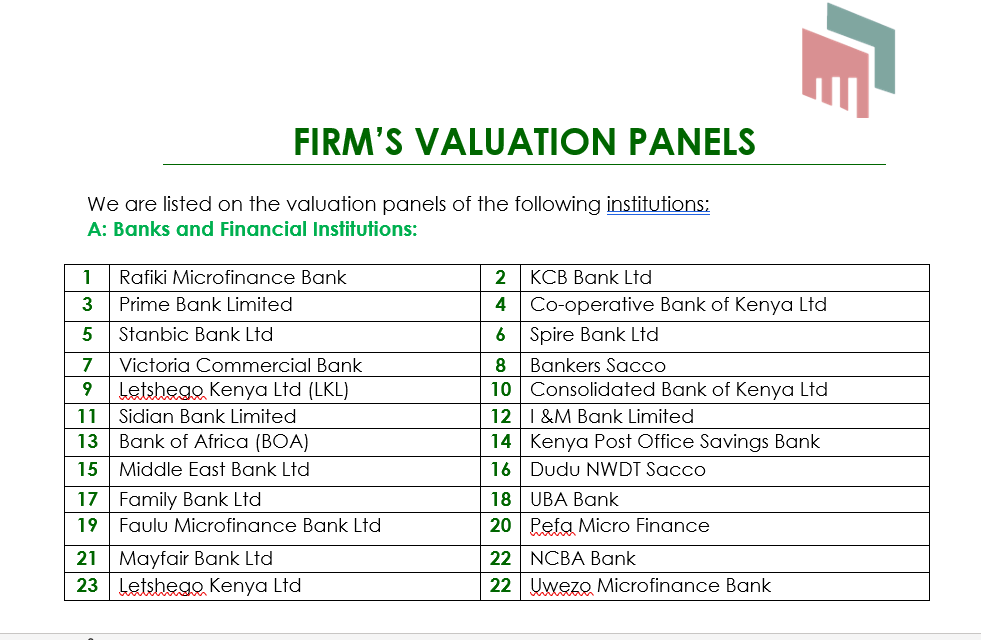 Advent Valuers Limited is a Limited Liability Property Consultancy Company incorporated in the Republic of Kenya under the Companies Act, Chapter 486 of the Laws of Kenya. The firm is located in Nairobi, with branches in Kisumu, Nakuru, Narok, Athi River and Meru, and has 38 members of staff who in their various capacities contribute to the success of professional services offered